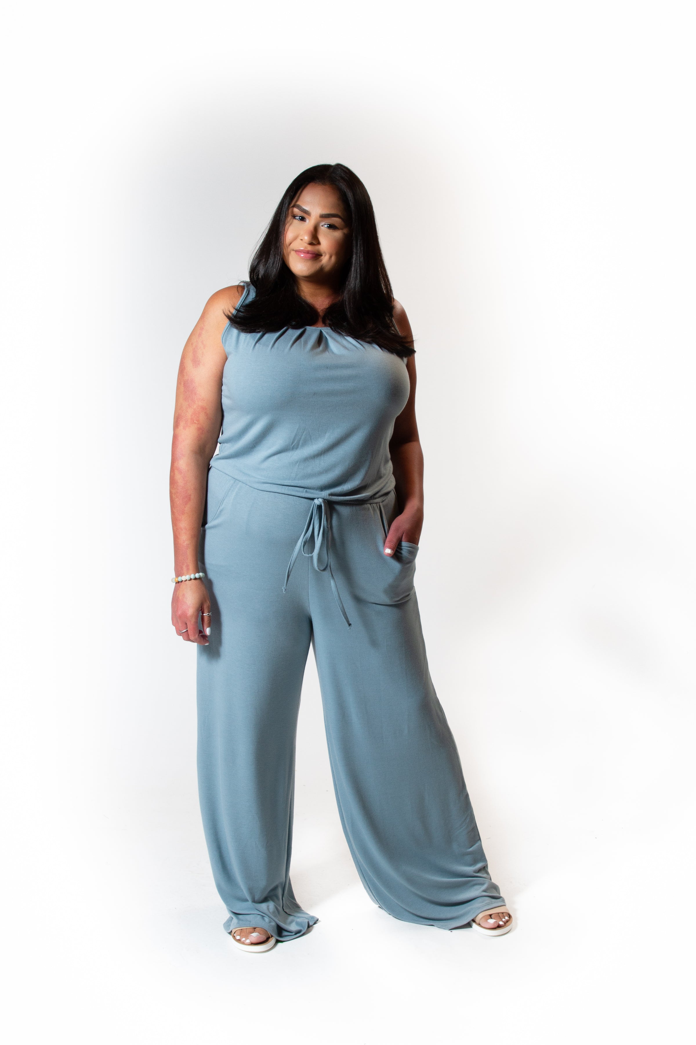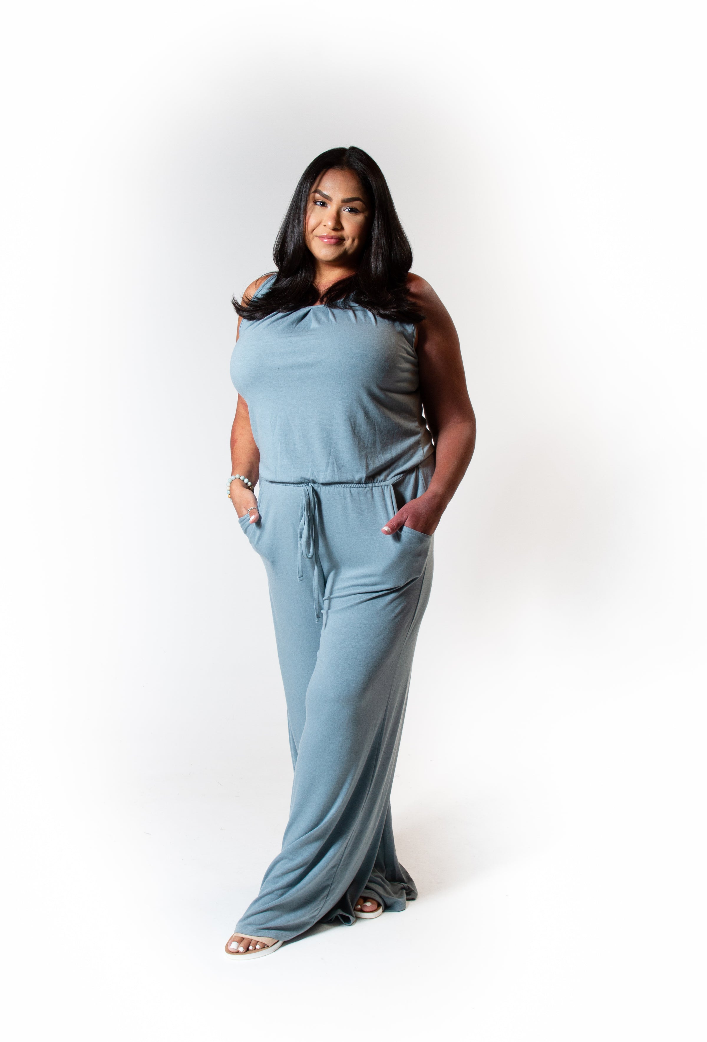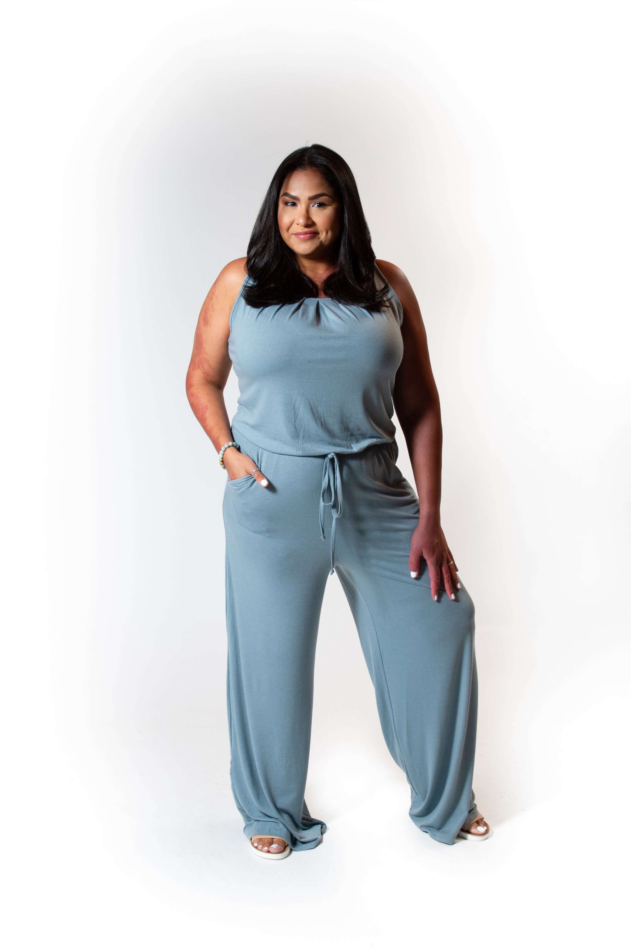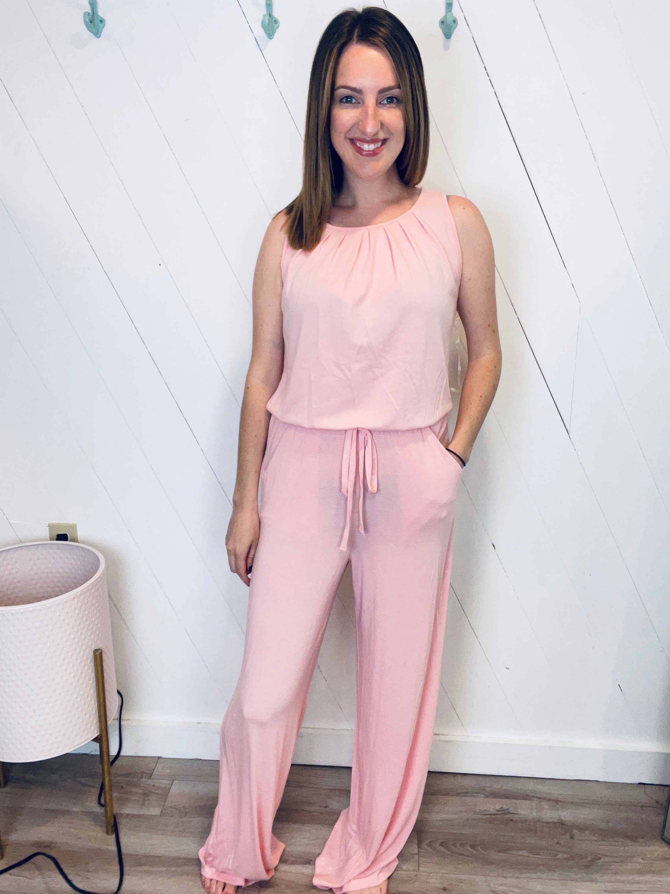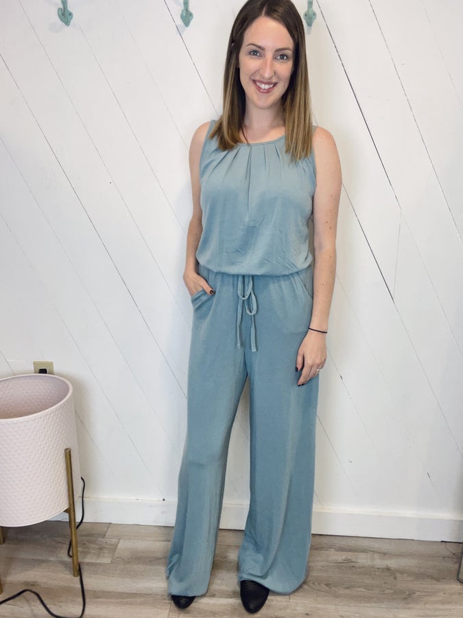 This flowy jumpsuit is the perfect outfit for those days when you can't figure out what to wear! Just throw it on, grab some shoes and go! The pleats in the top of this jumpsuit & wide legs make it a little classy, perfect for church or a nice event. True to size, elastic waist & pockets.