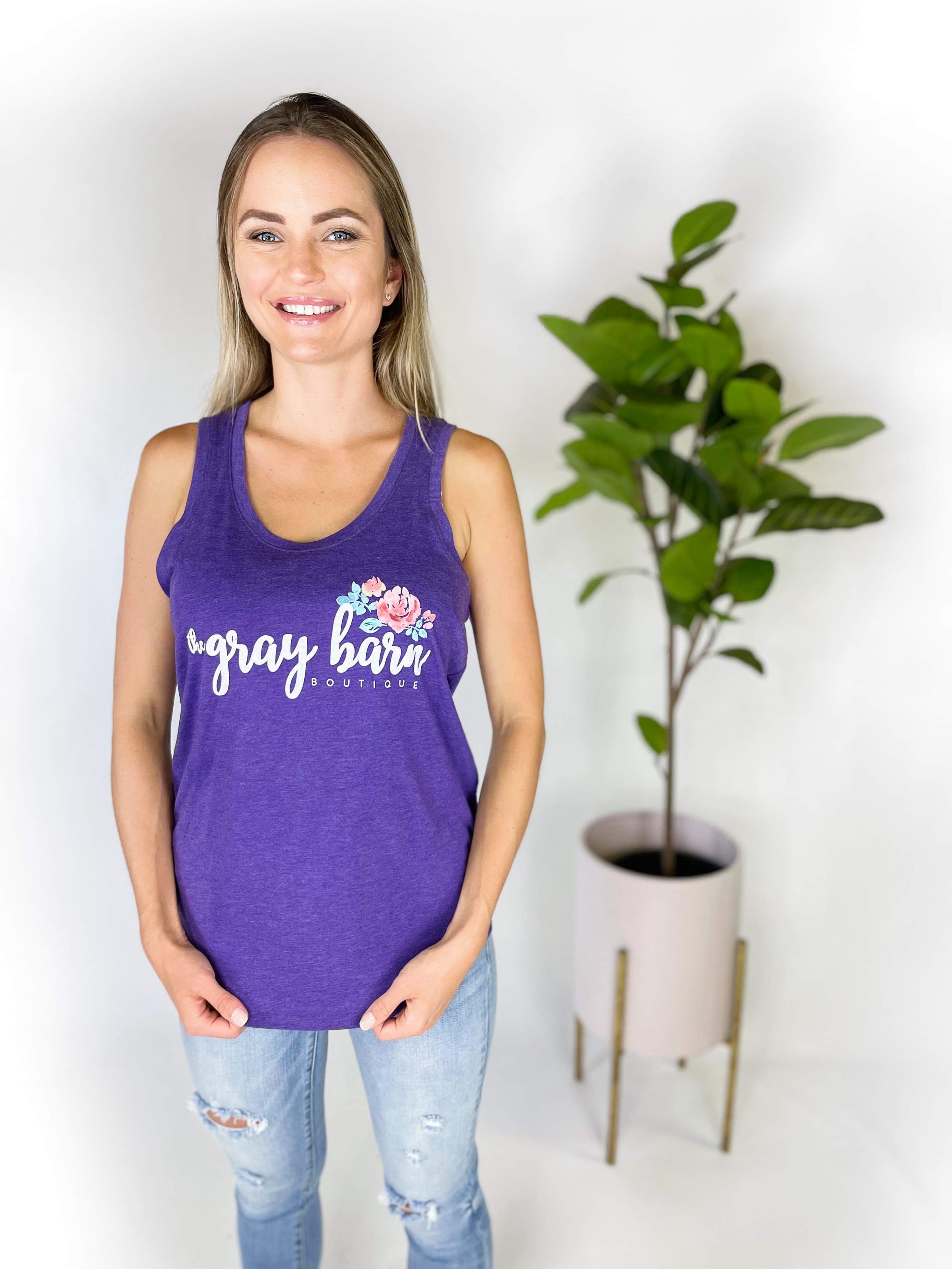 Rep your favorite boutique with these custom made racer back tanks! Featuring a bold purple color on the softest material, and of course, our gray barn logo.