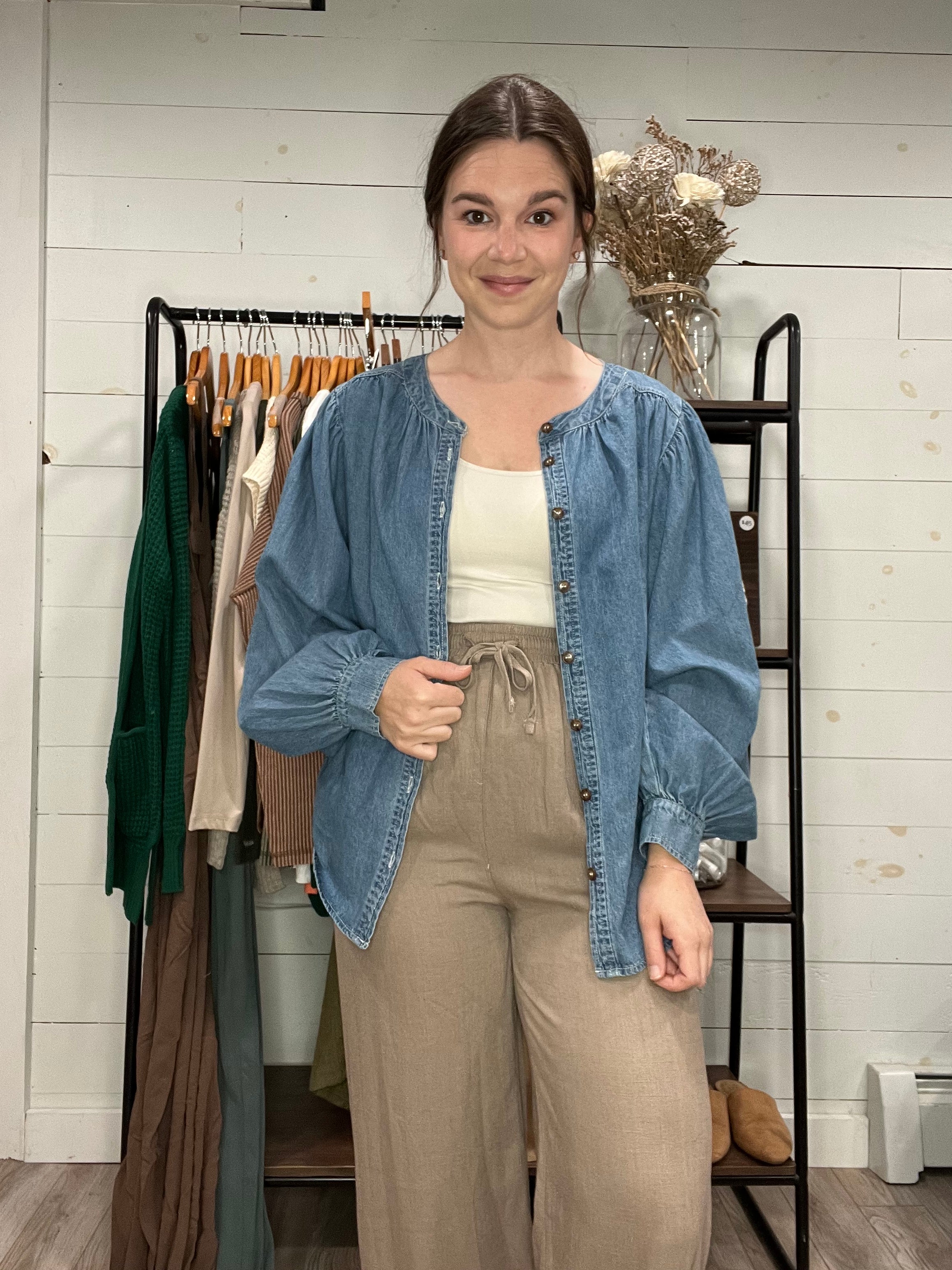 Alyssa (Size 2 or XS/S Tops, 3/4 jeans, 34B Bust, 5'2" tall) wears a size Small