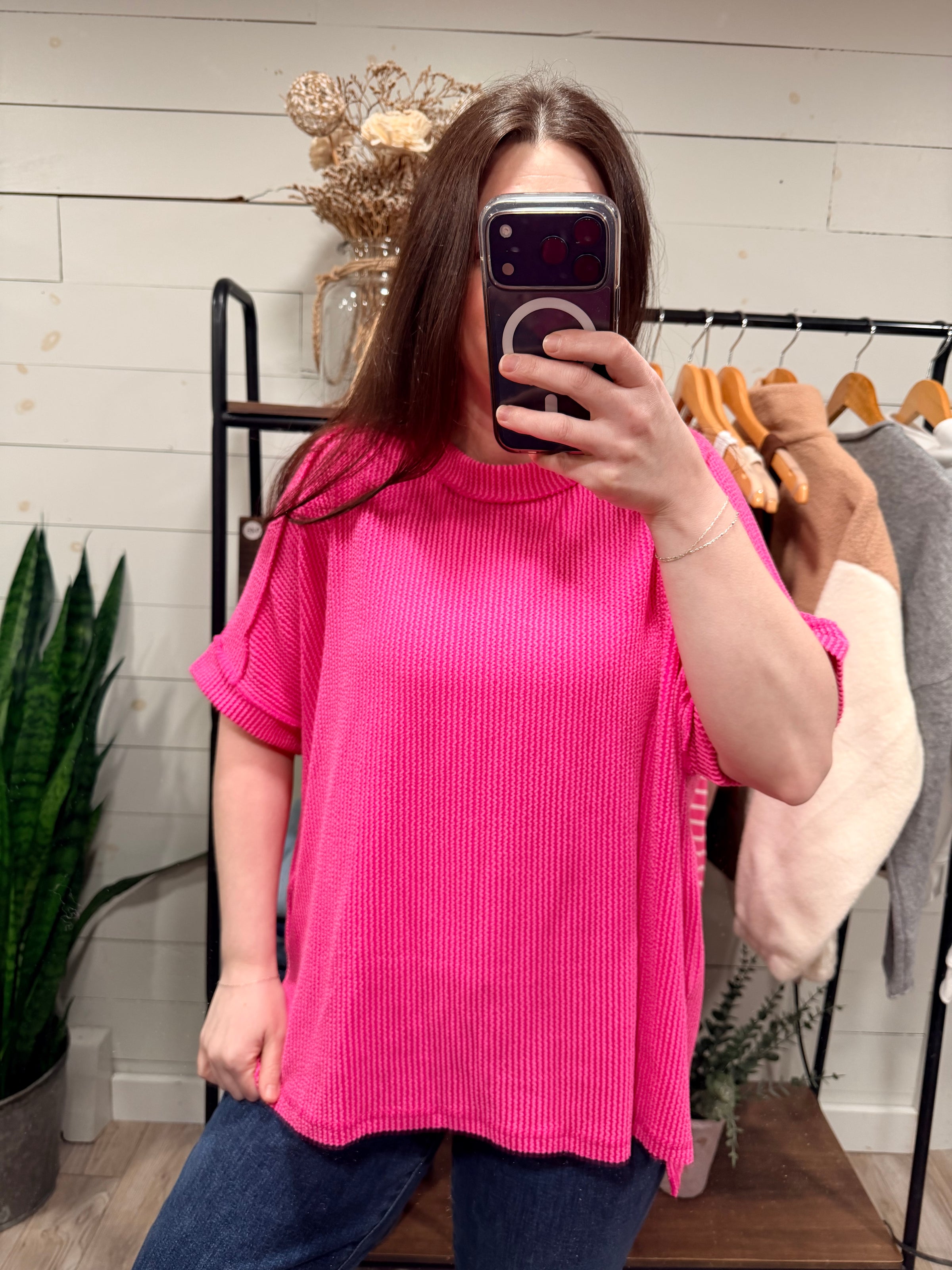 Raised Ribbed Short Sleeve Top in Hot Pink
