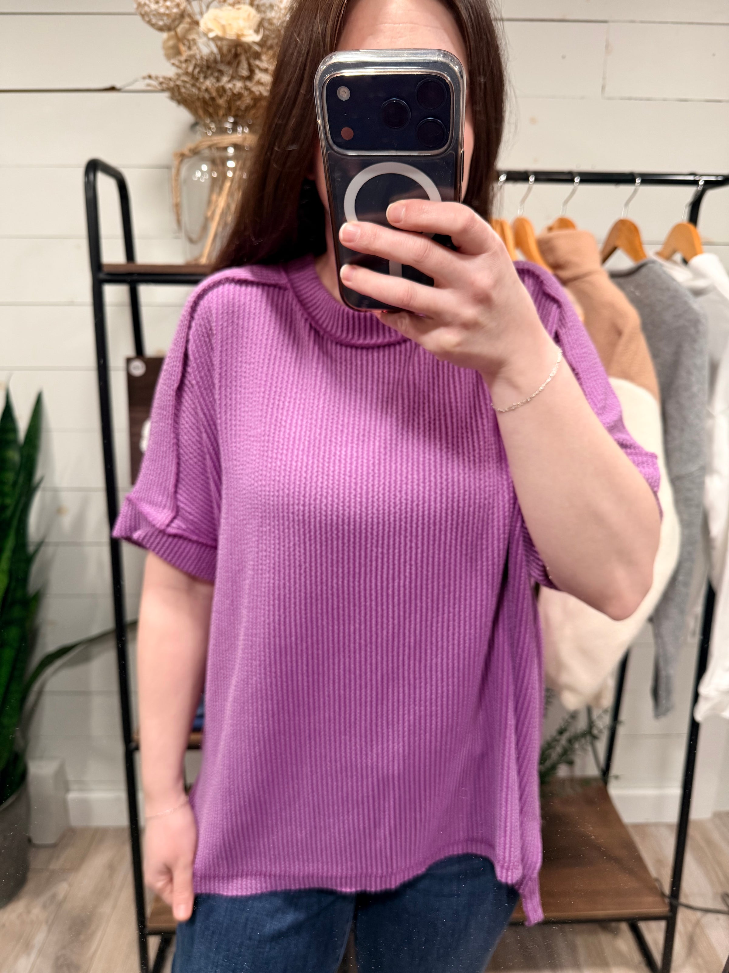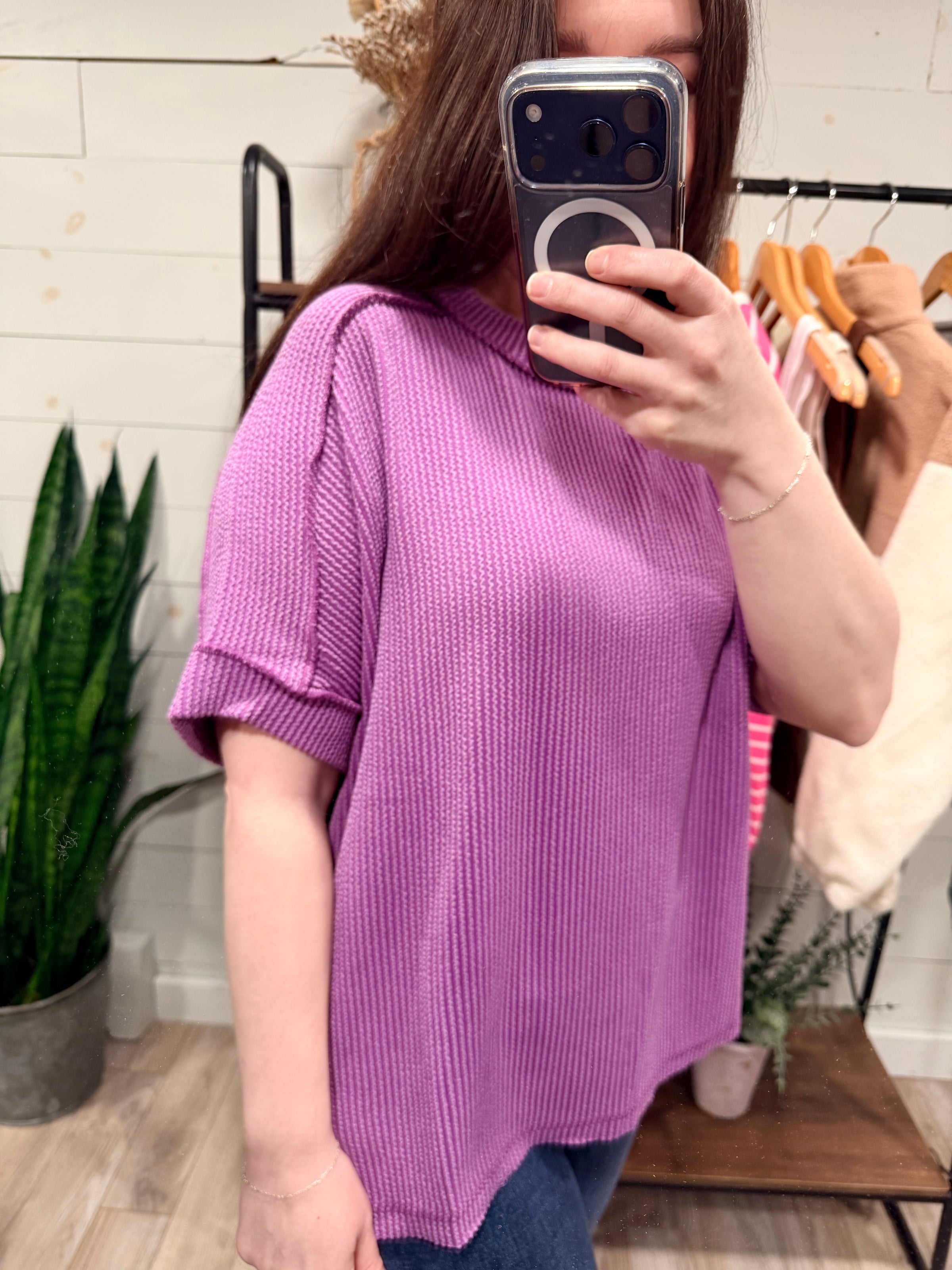 Raised Ribbed Short Sleeve Top in Plum
