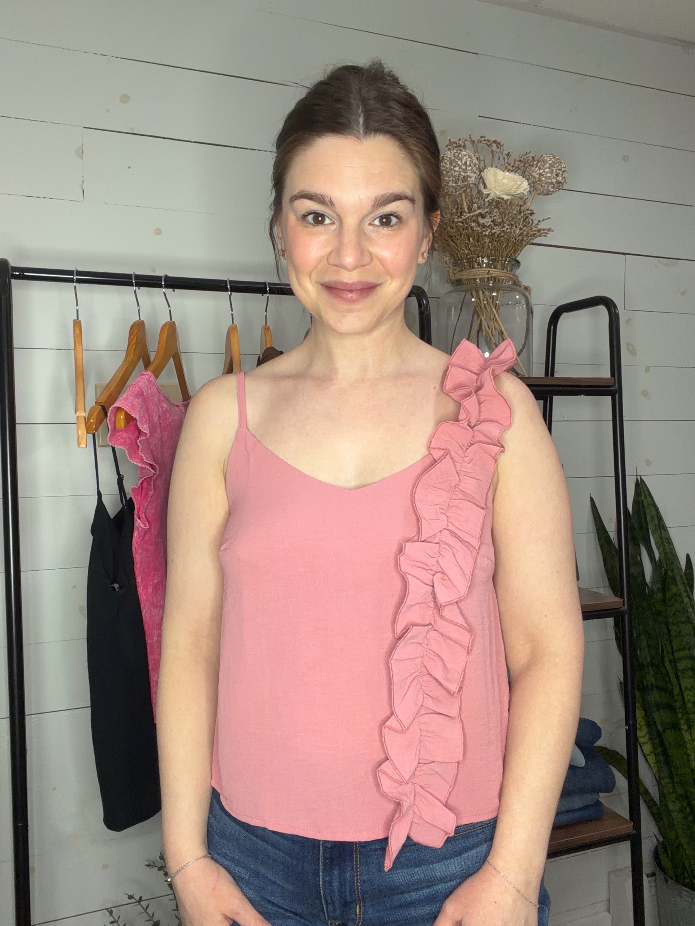 Make a statement with this delightfully textured Ruffle Shoulder Blouse in soft mauve. The eye-catching ruffled shoulder brings instant charm and movement to your look, while the rich fabric texture adds depth and visual interest. Whether you're dressing up for a special occasion or keeping it casual, this blouse strikes the perfect balance between fun and refined. The mauve hue pairs beautifully with neutrals or bold accessories, making it a versatile addition to any closet. Slip it on and let your personality shine through with effortless style and a touch of whimsy.