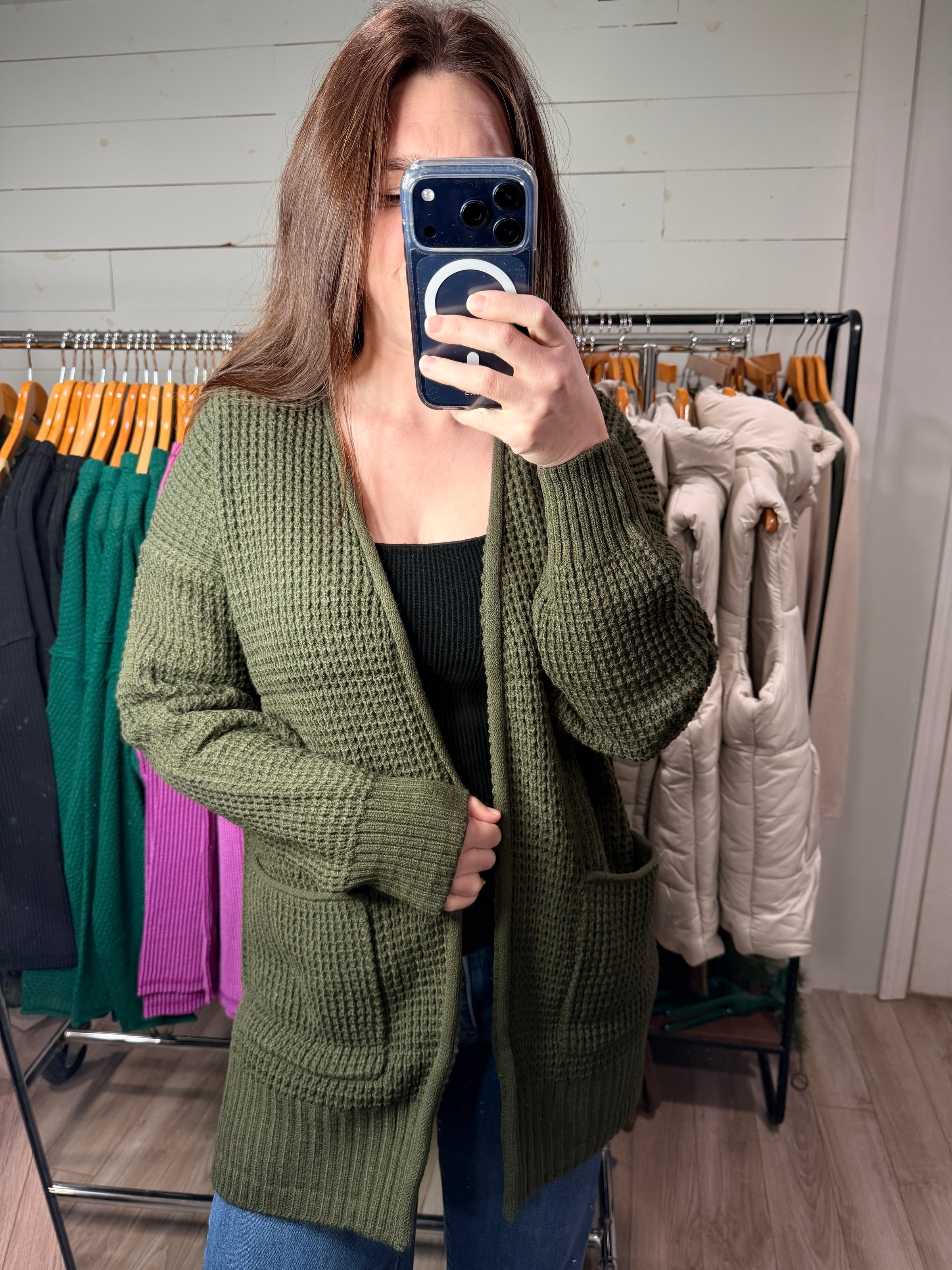 Unleash your inner fashionista with our Waffle Cardigan in Green! Made with breathable waffle material, it features an open front and front pockets for convenience. Perfect for layering with our Everyday Long Sleeves or cropped tanks. You'll be the envy of all your friends!