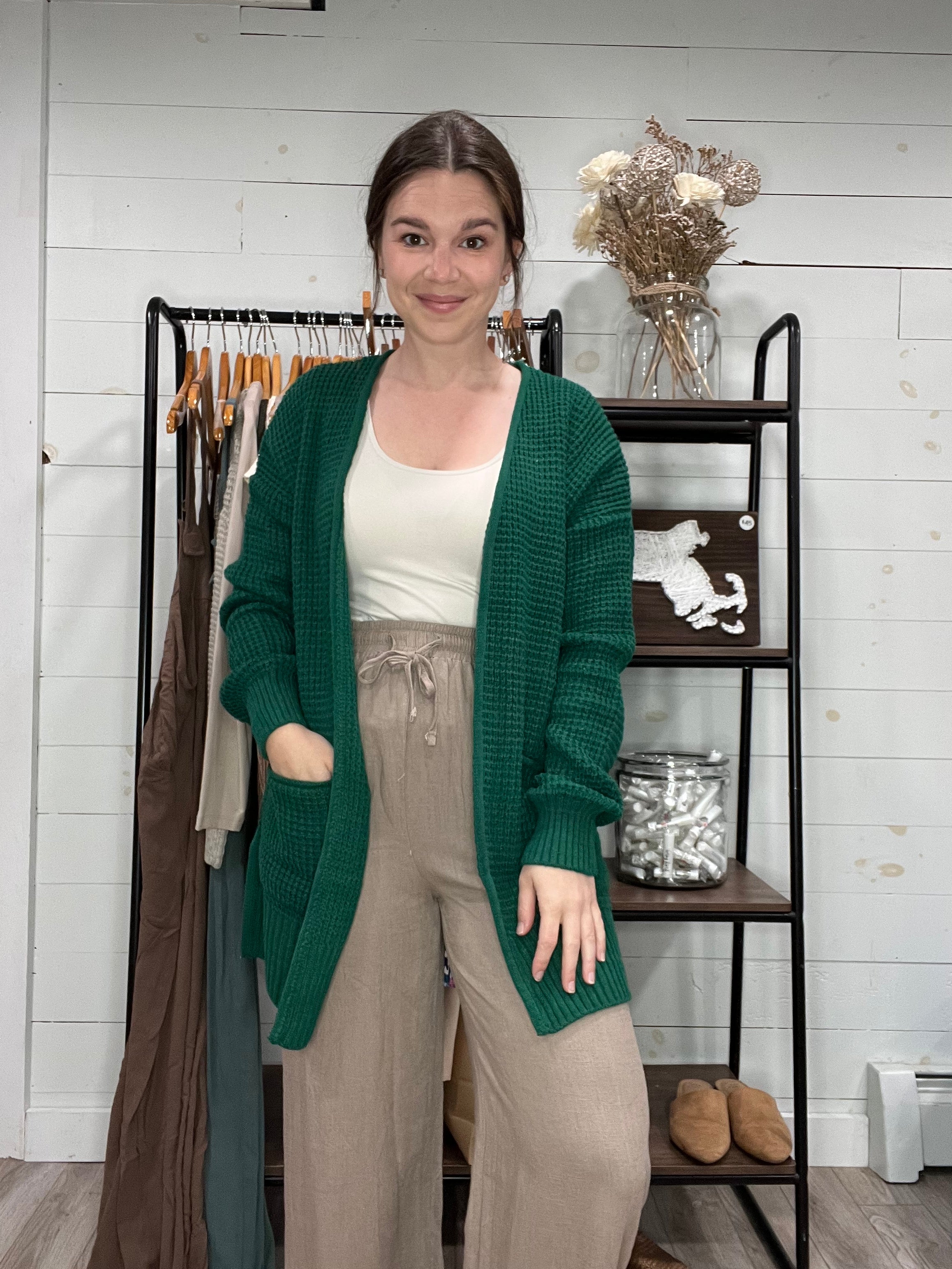 Unleash your inner fashionista with our Waffle Cardigan in Green! Made with breathable waffle material, it features an open front and front pockets for convenience. Perfect for layering with our Everyday Long Sleeves or cropped tanks. You'll be the envy of all your friends!
