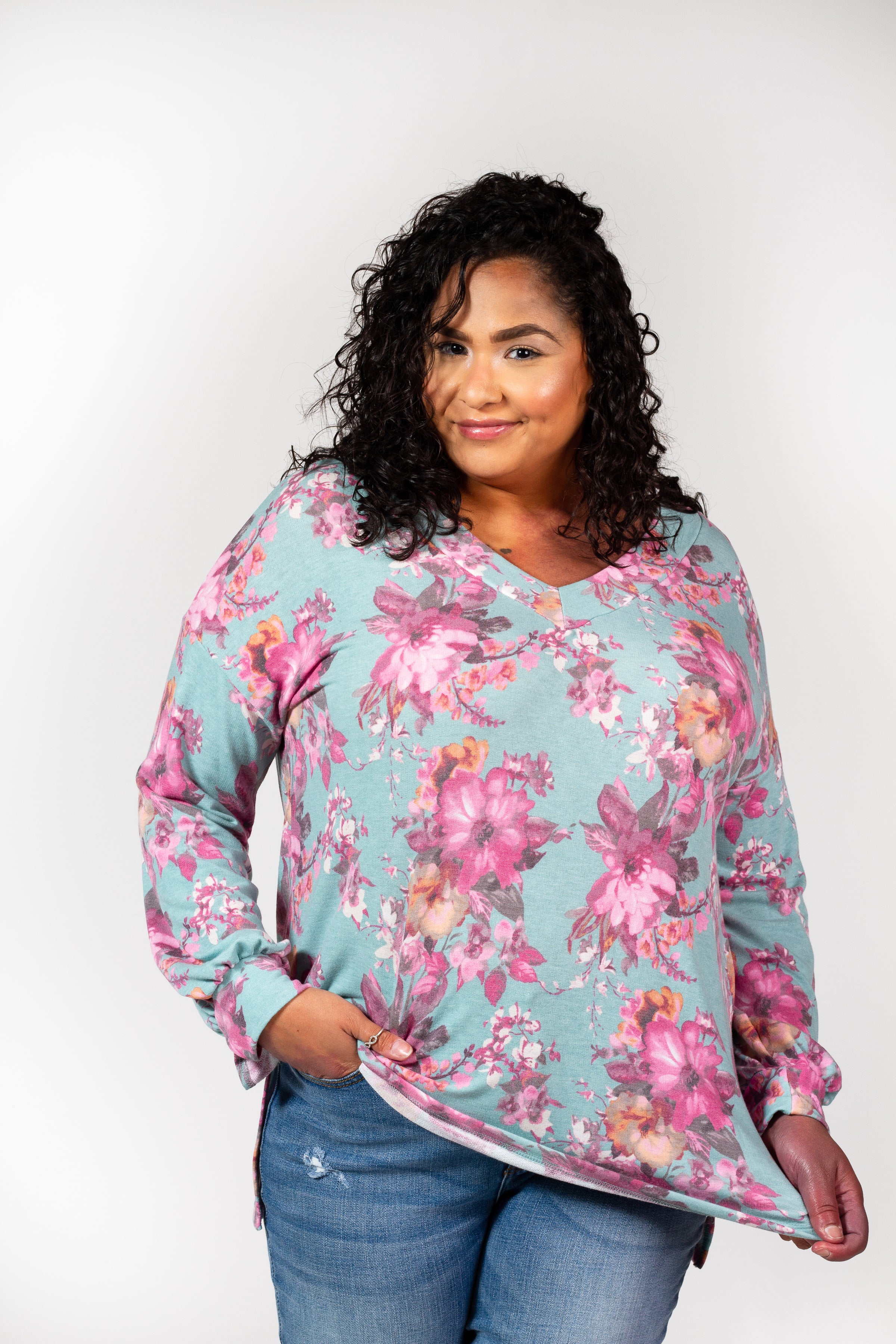 A long sleeve floral print knit top with a v-neck featuring bishop sleeves and side slits. Fabric is a lightweight french terry knit. So soft, cozy and perfect with denim or leggings!