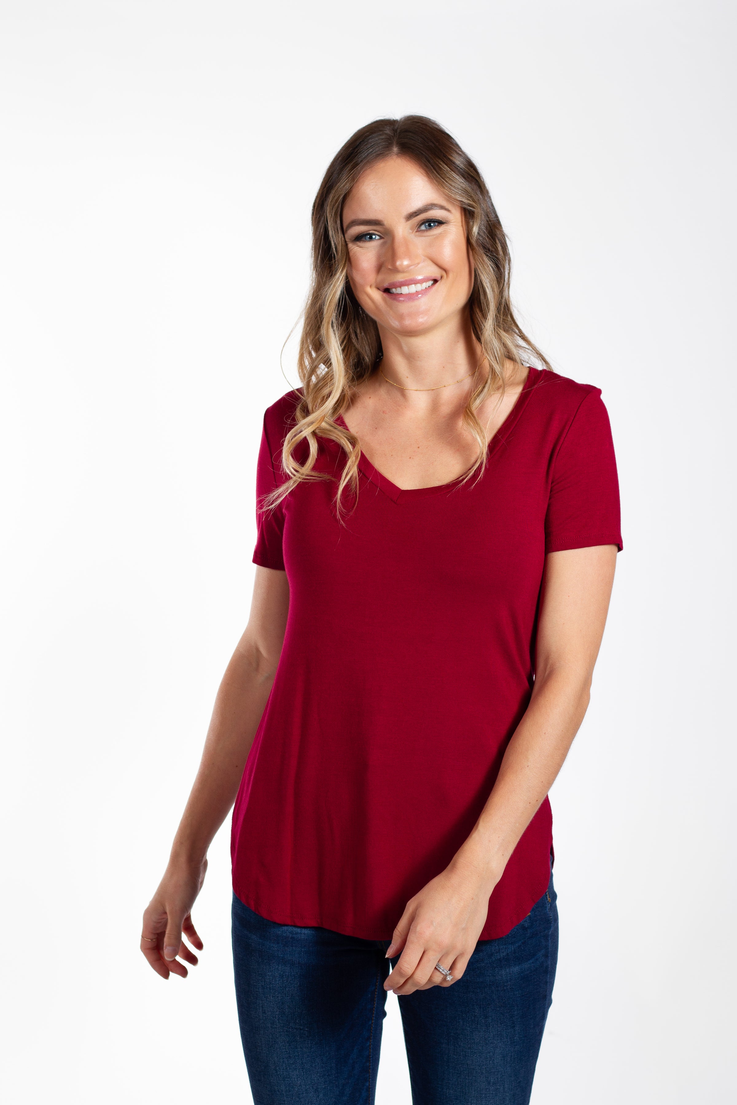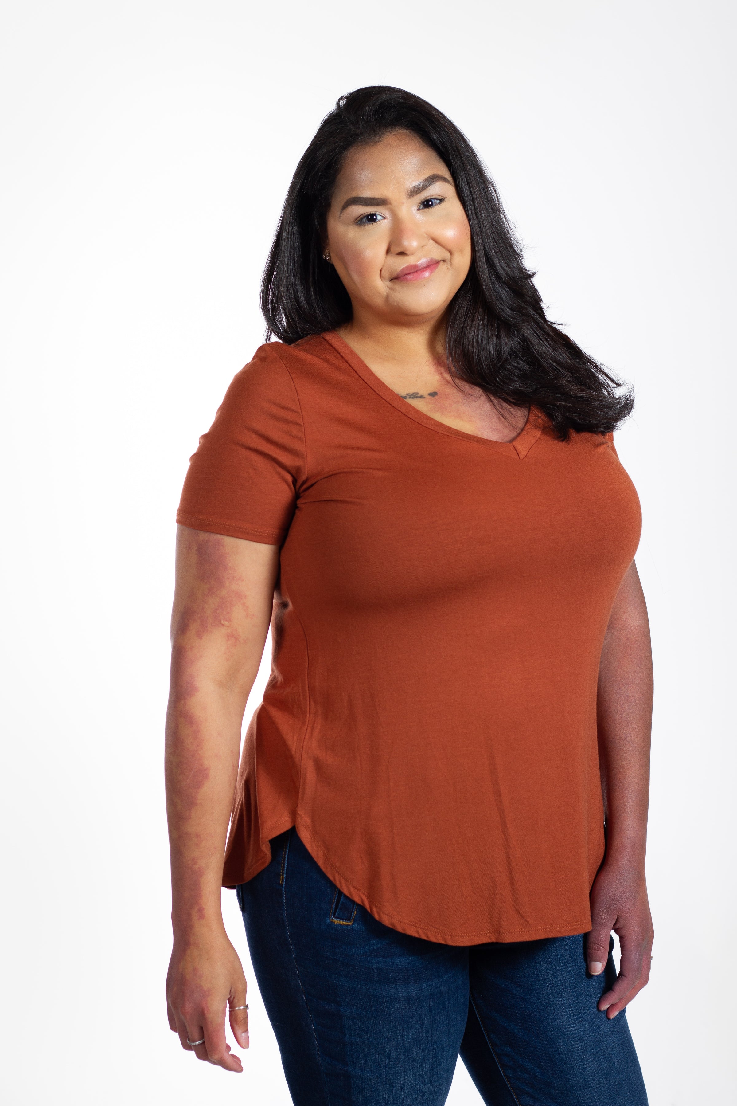 A lightweight casual T shirt that will pair with everything. This top is long enough to cover all of your assets whether in leggings or denim.